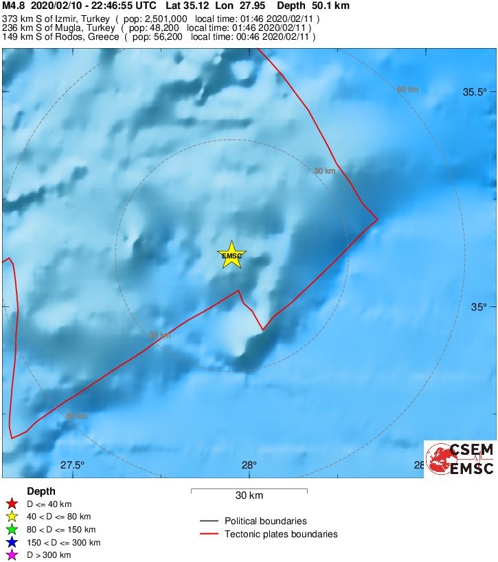 Σεισμός Τώρα: Σεισμική δόνηση μεγέθους 4,8 βαθμών της κλίμακας Ρίχτερ (σύμφωνα με την αυτόματη λύση του Ευρωπαϊκού - Μεσογειακού EMSC), σημειώθηκε στις 00:46 μετά τα μεσάνυχτα (ξημερώματα Τρίτης 11/2), σε υποθαλάσσια περιοχή, νοτιοανατολικά της Καρπάθου και νότια της Ρόδου.