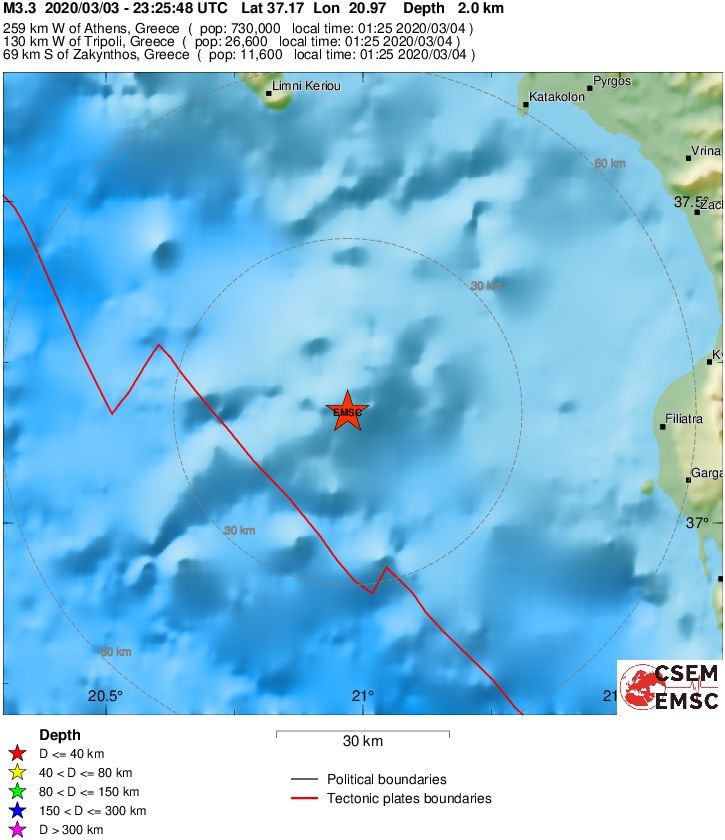 Σεισμός Τώρα - Σεισμός στη Ζάκυνθο - Όλες οι ειδήσεις: Ασθενής σεισμική δόνηση μεγέθους 3,3 βαθμών της κλίμακας Ρίχτερ, σύμφωνα με την αυτόματη προκαταρκτική λύση του Ευρωπαϊκού - Μεσογειακού Σεισμολογικού Ινστιτούτου (EMSC), σημειώθηκε τα ξημερώματα της Τετάρτης (4/3) στη 01:25, σε υποθαλάσσια περιοχή του Ιονίου, νότια της Ζακύνθου.