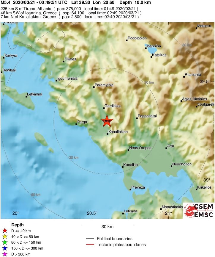 Το εστιακό βάθος σύμφωνα με το Γεωδυναμικό Ινστιτούτο Αθηνών ήταν 10 χλμ. Στην ίδια περιοχή είχε σημειωθεί το βράδυ της Παρασκευής, στις 23:38, σεισμική δόνηση μεγέθους 4,3 βαθμών της κλίμακας Ρίχτερ.