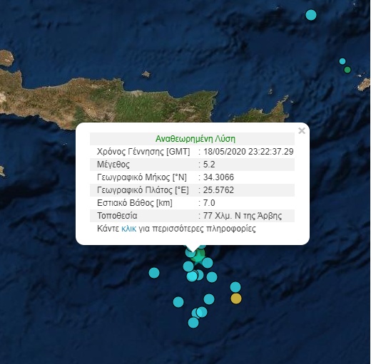 Υπενθυμίζεται ότι στις 2:22 τα ξημερώματα σημειώθηκε σεισμός 5,2 Ρίχτερ -με επίκεντρο θαλάσσια περιοχή 77 χιλιόμετρα νότια της Άρβης και εστιακό βάθος 7 χλμ.