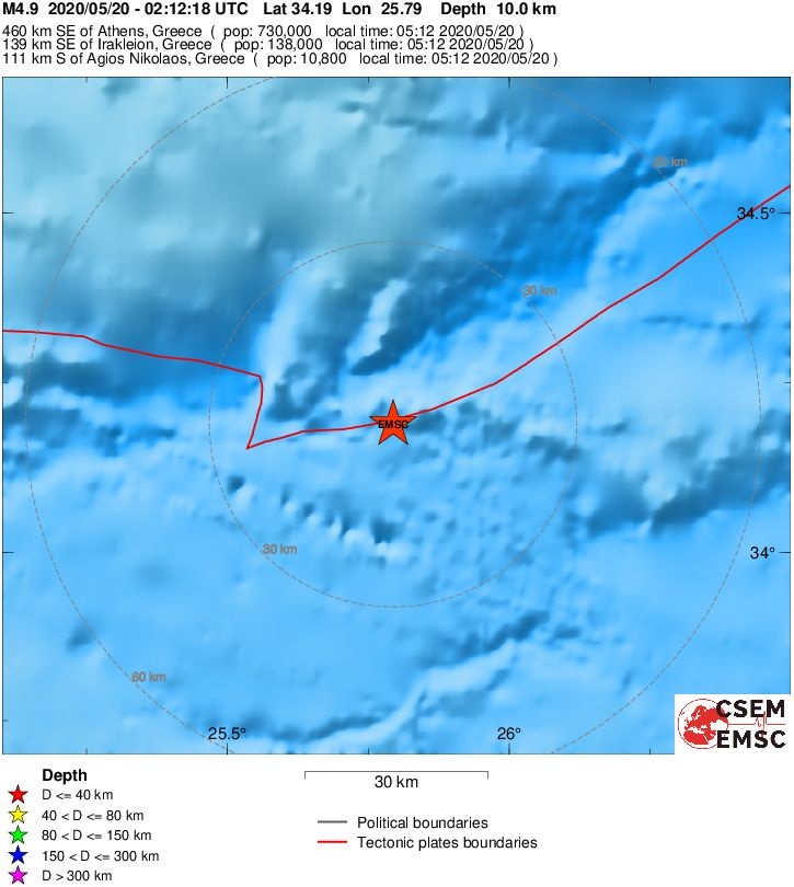 Ο σεισμός σημειώθηκε στις 05:12 ώρα Ελλάδος και σε απόσταση 452 χιλιόμετρα νότια/νοτιοανατολικά της Αθήνας.