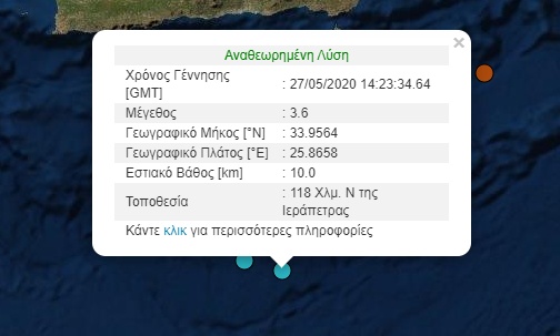 Ο σεισμός έγινε στη θάλασσα, στις 17.23, με επίκεντρο 118 χιλιόμετρα βόρεια της Ιεράπετρας. Το εστιακό βάθος του σεισμού, ήταν 10 χιλιόμετρα.