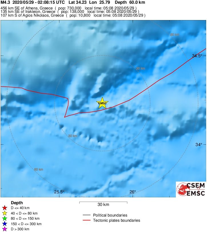 Το ακριβές επίκεντρο τη δόνησης εντοπίζεται στα 135 χλμ. νότια του Ηράκλειου Κρήτης.