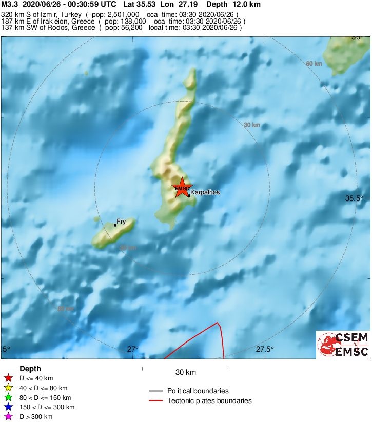 Σεισμός Τώρα: Ασθενής σεισμική δόνηση μεγέθους 3,3 βαθμών της κλίμακας Ρίχτερ, σύμφωνα με την αυτόματη λύση του Ευρωπαϊκού - Μεσογειακού Ινστιτούτου (EMSC), σημειώθηκε τα ξημερώματα της Παρασκευής 26/6), στο νσηί της Καρπάθου.