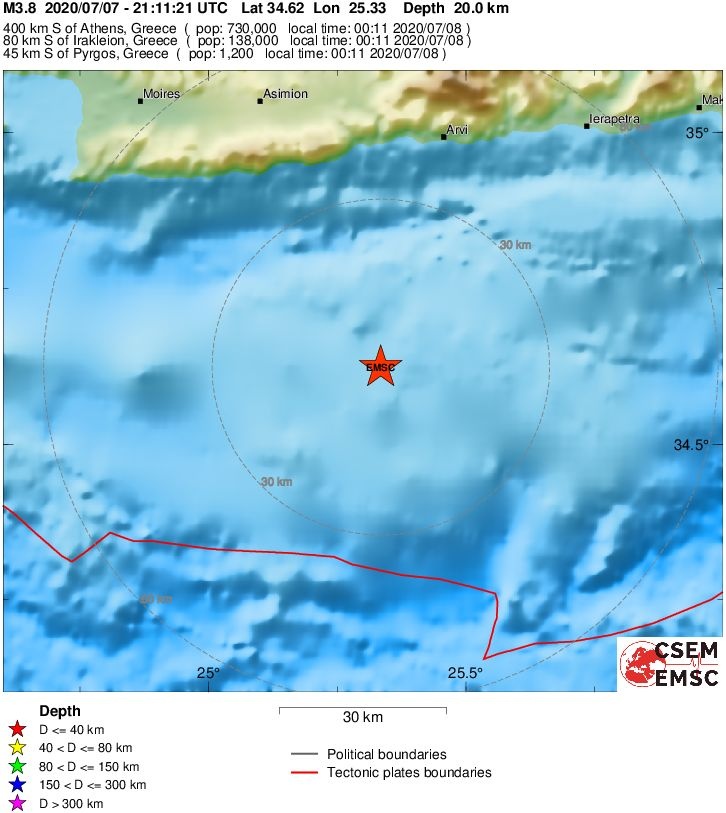 Το ακριβές επίκεντρο τη δόνησης εντοπίζεται στα 80 χλμ. νότια του Ηράκλειου Κρήτης.