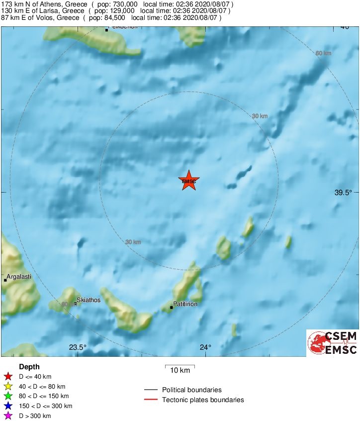 Το ακριβές επίκεντρο τη δόνησης εντοπίζεται στα 87 χλμ. ανατολικά του Βόλου.