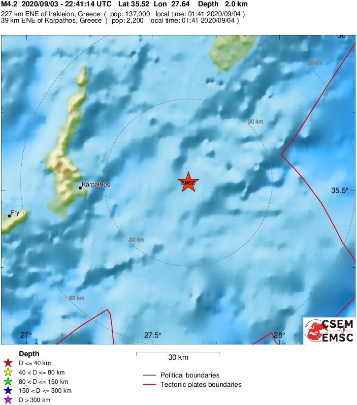 Το ακριβές επίκεντρο της δόνησης εντοπίζεται στα 39 χλμ. ανατολικά της Καρπάθου.