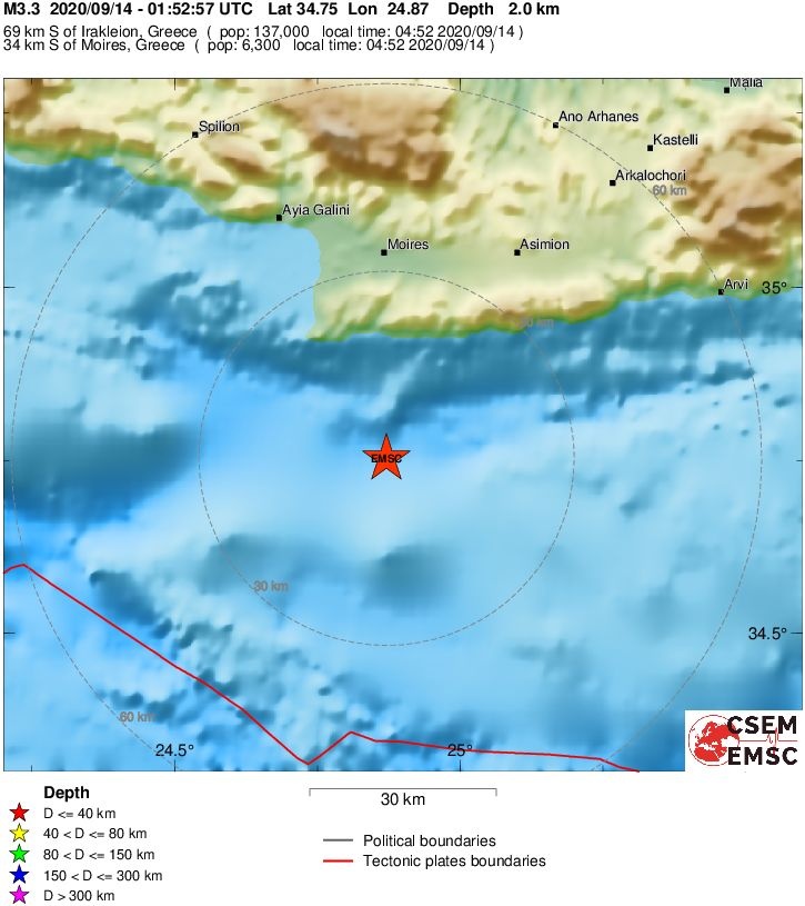 Σεισμός Τώρα: Ασθενής σεισμική δόνηση μεγέθους 3,3 βαθμών της κλίμακας Ρίχτερ, σύμφωνα με την αυτόματη λύση του Ευρωπαϊκού - Μεσογειακού Σεισμολογικού Ινστιτούτου (EMSC), σημειώθηκε τα ξημερώματα της Δευτέρας (14/9), στις 04:52, σε υποθαλάσσια περιοχή του Νότιου Κρητικού Πελάγους.