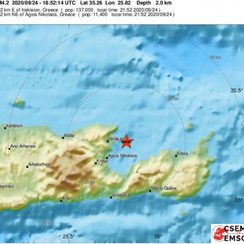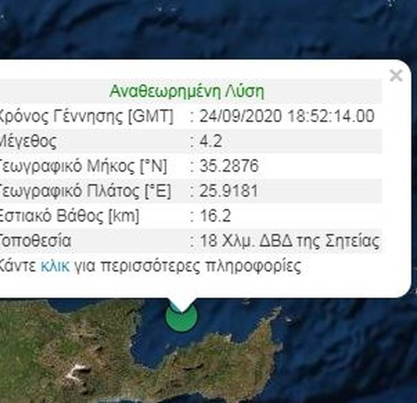 Σεισμός ΤΩΡΑ: Σεισμική δόνηση 4,2 βαθμών της κλίμακας Ρίχτερ σημειώθηκε στις 21.52 το βράδυ της Πέμπτης (24/09) στην Κρήτη, στη θαλάσσια περιοχή ανατολικά του νησιού
