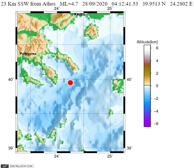 H αναθεωρημένη λύση του Γεωδυναμικού Ινστιτούτου του Αστεροσκοπείου Αθηνών δίνει το σεισμό στα 4,7 Ρίχτερ, με εστιακό βάθος τα 17,5 χλμ., και επίκεντρο τα 23 χλμ. νοτιοδυτικά του Άθου.