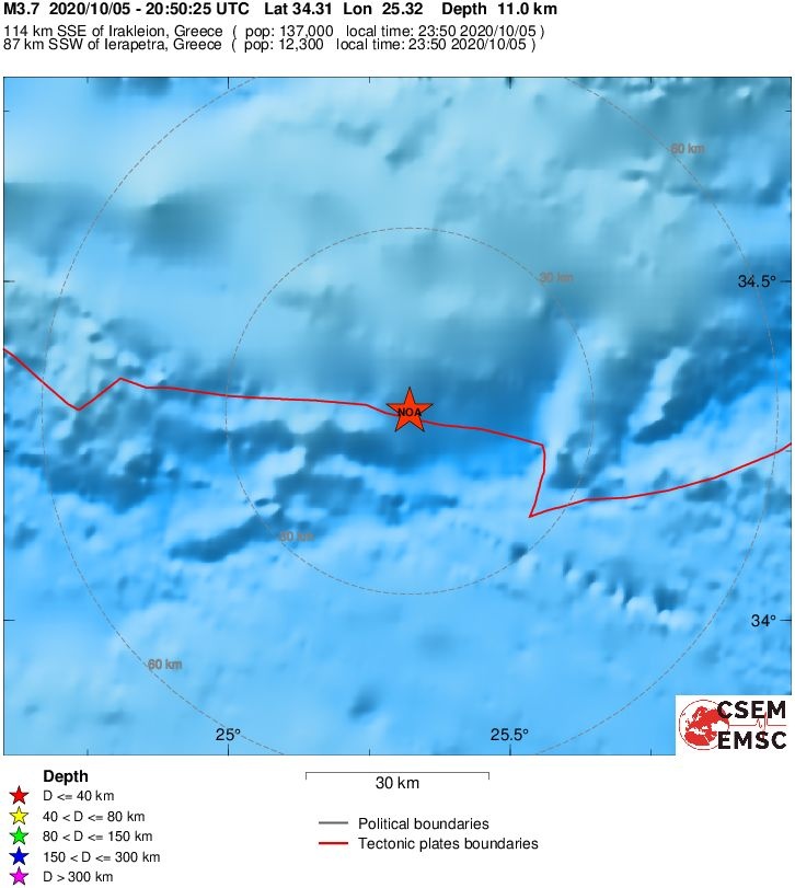 Το ακριβές επίκεντρο τη δόνησης εντοπίζεται στα 114 χλμ. νότια του Ηράκλειου Κρήτης.
