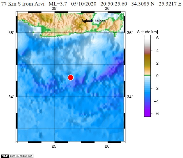 H αυτόματη λύση του Γεωδυναμικού Ινστιτούτου του Αστεροσκοπείου Αθηνών δίνει το σεισμό στα 3,7 Ρίχτερ, με εστιακό βάθος τα 11 χλμ., και επίκεντρο τα 77 χλμ. νότια της Άρβης.
