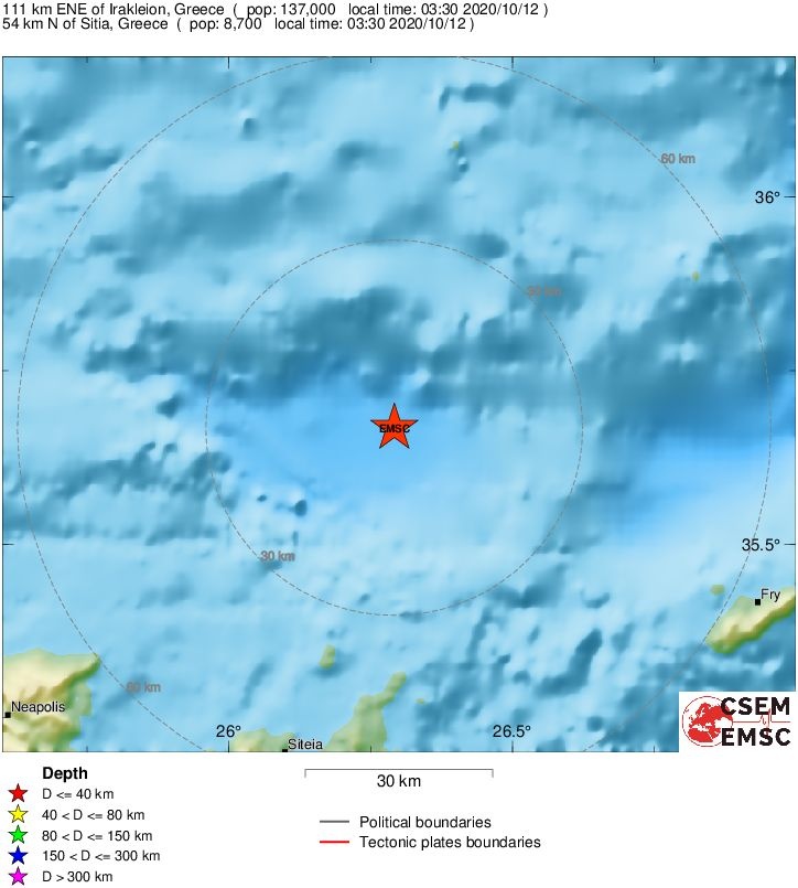 Το ακριβές επίκεντρο τη δόνησης εντοπίζεται στα 54 χλμ. βόρεια της Σητείας.