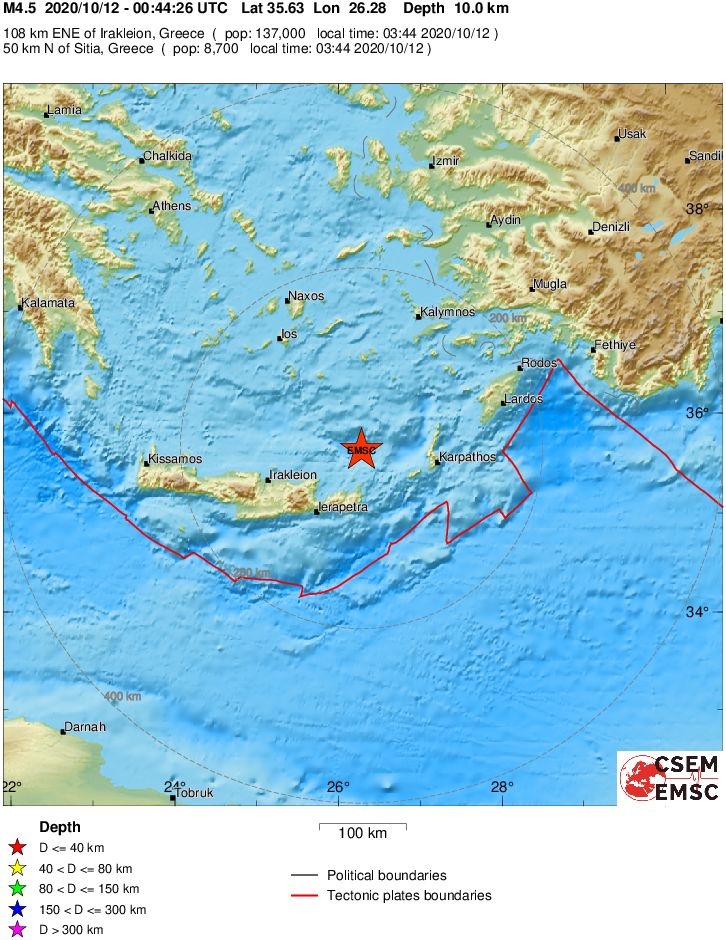 Σεισμός Τώρα: Σεισμική δόνηση μεγέθους 4,9 βαθμών της κλίμακας Ρίχτερ, σύμφωνα με την αυτόματη λύση του Ευρωπαϊκού - Μεσογειακού Σεισμολογικού Ινστιτούτου (EMSC), σημειώθηκε τα ξημερώματα της Δευτέρας (12/10), στις 03:30, σε υποθαλάσσια περιοχή της ανατολικής Κρήτης, στο Βόρειο Κρητικό Πέλαγος.
