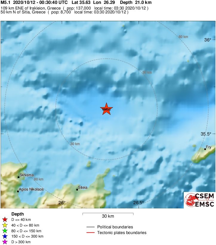 Από την πλευρά του, και το Ευρωπαϊκό - Μεσογειακό Σεισμολογικό Ινστιτούτο (EMSC), κατέγραψε το σεισμό των 03:30, στα 5,1 Ρίχτερ.