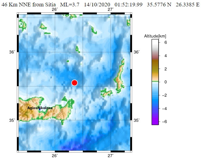 H αυτόματη λύση του Γεωδυναμικού Ινστιτούτου του Αστεροσκοπείου Αθηνών δίνει το σεισμό στα 3,9 Ρίχτερ, με εστιακό βάθος τα 10 χλμ., και επίκεντρο τα 46 χλμ. βόρεια-βορειοανατολικά της Σητείας.