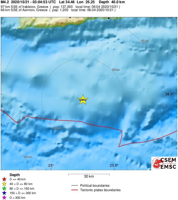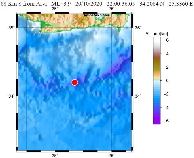 Το ακριβές επίκεντρο τη δόνησης εντοπίζεται στα 97 χλμ. νότια-νοτιοανατολικά του Ηράκλειου Κρήτης.