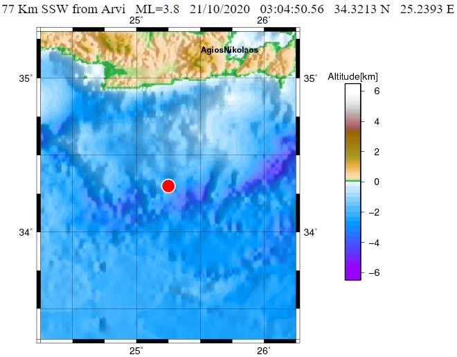 H αναθεωρημένη λύση του Γεωδυναμικού Ινστιτούτου του Αστεροσκοπείου Αθηνών δίνει το σεισμό στα 3,8 Ρίχτερ, με εστιακό βάθος τα 27 χλμ., και επίκεντρο τα 77 χλμ. νότια-νοτιοδυτικά της Άρβης.