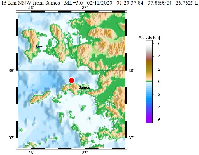 H αναθεωρημένη λύση του Γεωδυναμικού Ινστιτούτου του Αστεροσκοπείου Αθηνών δίνει το σεισμό στα 3,0 Ρίχτερ, με εστιακό βάθος τα 10 χλμ., και επίκεντρο τα 15 χλμ. βόρεια - βορειοδυτικά της Σάμου.