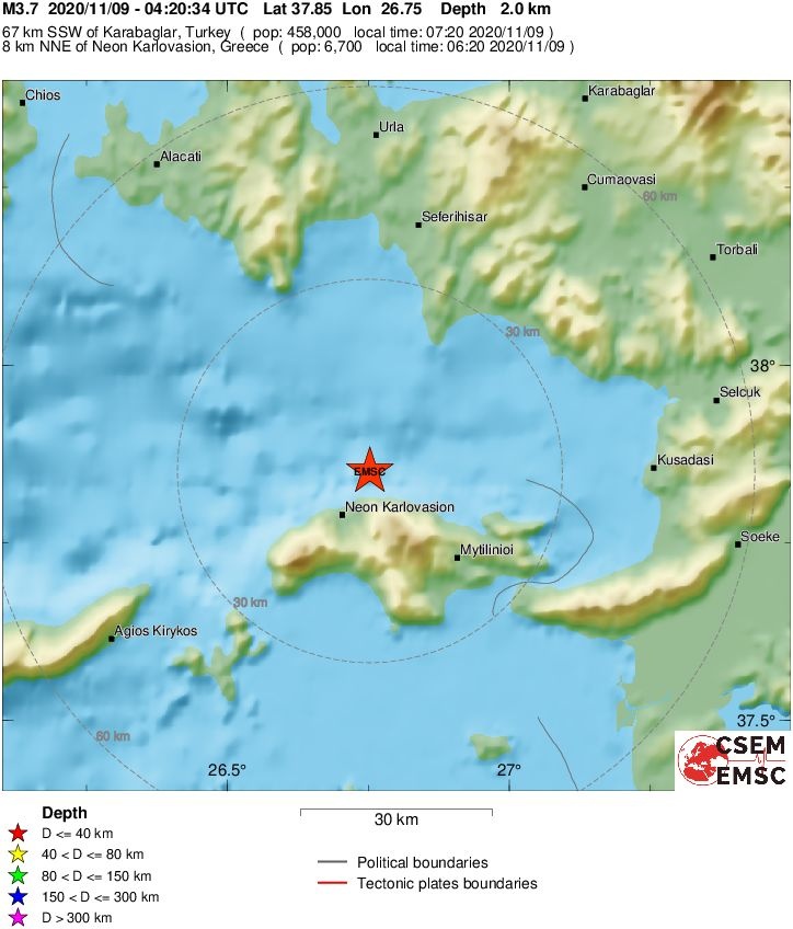 H αυτόματη λύση του Γεωδυναμικού Ινστιτούτου του Αστεροσκοπείου Αθηνών δίνει το σεισμό στα 3,3 Ρίχτερ, με εστιακό βάθος τα 10 χλμ., και επίκεντρο τα 10 χλμ. βόρεια-βορειοδυτικά της Σάμου.