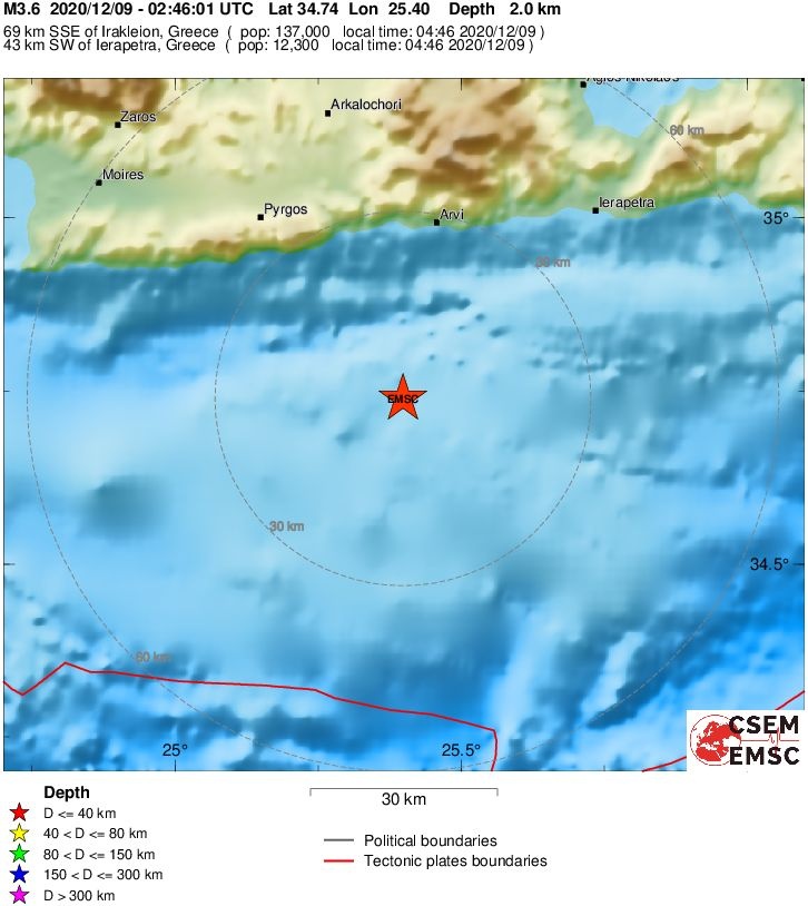 Το εστιακό βάθος του σεισμού, σύμφωνα με την εκτίμηση του EMSC, υπολογίζεται στα 2 χλμ.