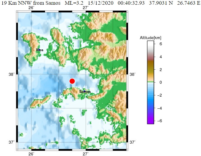 H αυτόματη λύση του Γεωδυναμικού Ινστιτούτου του Αστεροσκοπείου Αθηνών δίνει το σεισμό στα 3,2 Ρίχτερ, με εστιακό βάθος τo 1 χλμ., και επίκεντρο τα 19 χλμ. ανατολικά - βορειοανατολικά της Σάμου.