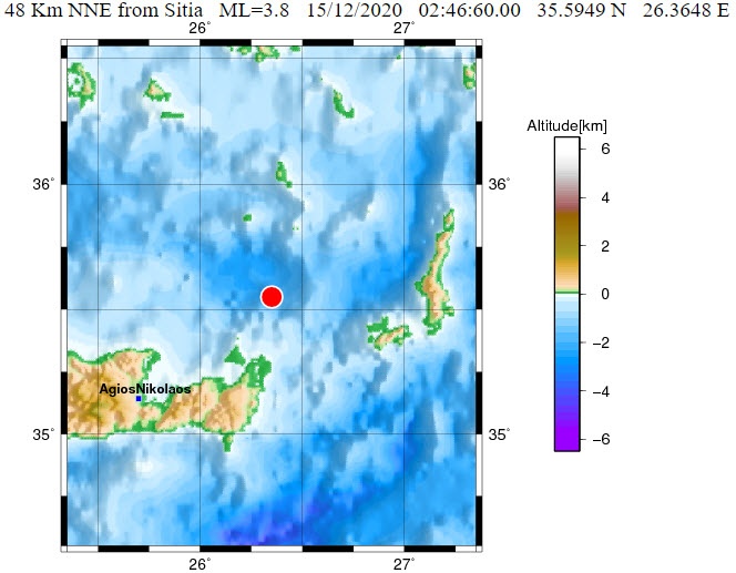 H αυτόματη λύση του Γεωδυναμικού Ινστιτούτου του Αστεροσκοπείου Αθηνών δίνει το σεισμό στα 3,8 Ρίχτερ, με εστιακό βάθος τα 10 χλμ., και επίκεντρο τα 48 χλμ. βόρεια-βορειοανατολικά της Σητείας.