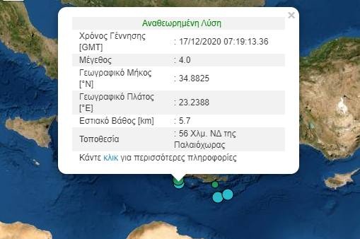 Σεισμός 4 Ρίχτερ στην Κρήτη - Αισθητός σε Παλαιόχωρα και Χανιά