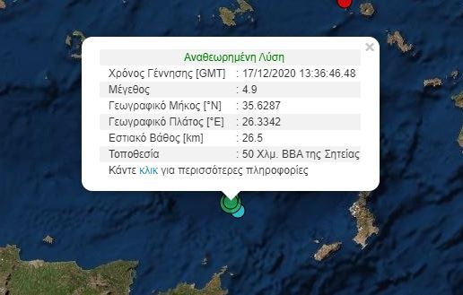 Χθες (17/12) ισχυρή σεισμική δόνηση μεγέθους 4,9 βαθμών της κλίμακας Ρίχτερ, σημειώθηκε, σε υποθαλάσσια περιοχή της Κρήτης.