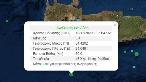 Σεισμός Τώρα: Ασθενής σεισμική δόνηση 3,4 βαθμών της κλίμακας Ρίχτερ, σημειώθηκε, σύμφωνα με Γεωδυναμικό Ινστιτούτο, το πρωί της Παρασκευής (18/12) στη θαλάσσια περιοχή νότια της Γαύδου.