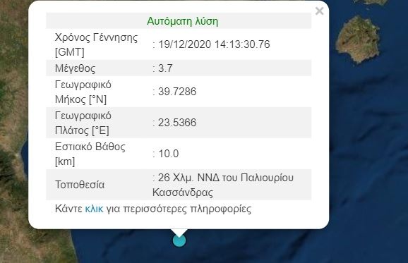 Σεισμός σημειώθηκε στις 16:13 το Σάββατο (19/12) στο Παλιούρι Κασσάνδρας.