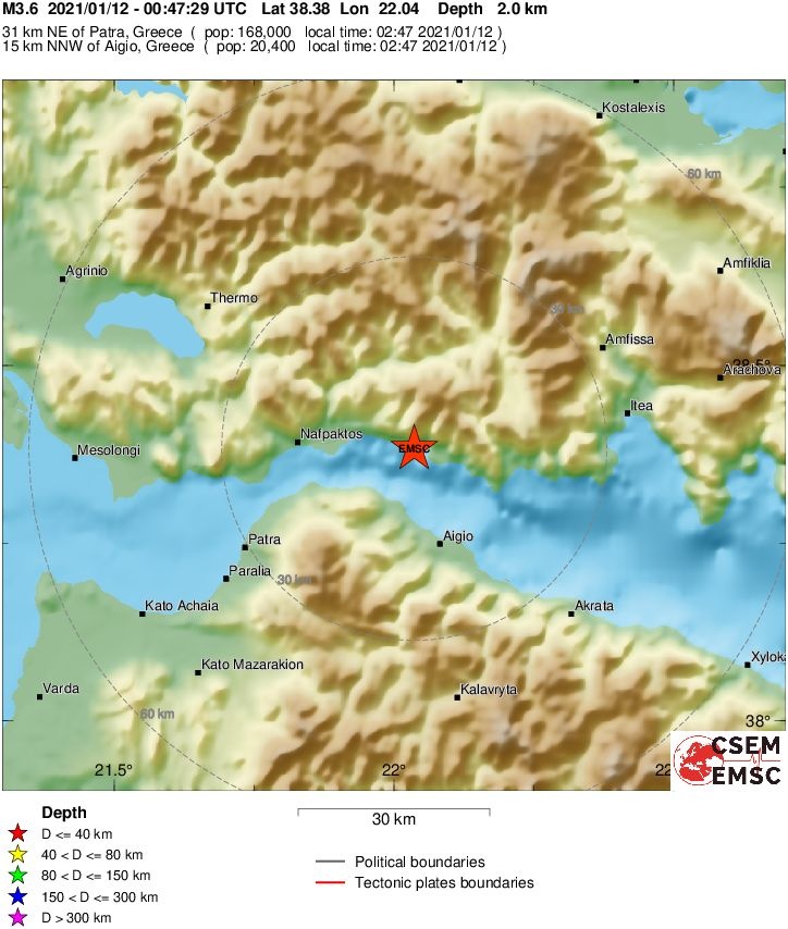 H αναθεωρημένη λύση του Γεωδυναμικού Ινστιτούτου του Αστεροσκοπείου Αθηνών δίνει το σεισμό στα 3,6 Ρίχτερ, με εστιακό βάθος τα 10,2 χλμ., και επίκεντρο τα 16 χλμ. βόρεια του Αιγίου.