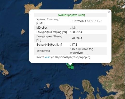Το εστιακό βάθος του σεισμού της Μυτιλήνης των 4,8 Ρίχτερ υπολογίστηκε στα 17,3χλμ. και το επίκεντρό του στον θαλάσσσιο χώρο 45 χλμ. νότια-νοτιοδυτικά του νησιού.