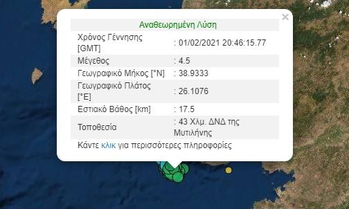 Σύμφωνα με το Γεωδυναμικό Ινστιτούτο, το επίκεντρο του σεισμού εντοπίζεται 43χλμ δυτικά - νοτιοδυτικά της Μυτιλήνης και είχε εστιακό βάθος 17,5χλμ.
