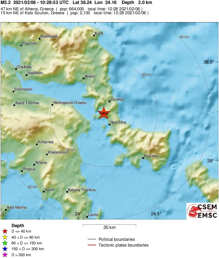 Σύμφωνα με το Ευρωμεσογειακό Ινστιτούτο, ο σεισμός «χτύπησε» την Εύβοια έχοντας ένταση 3,2 της κλίμακας Ρίχτερ και εστιακό βάθος δύο χιλιόμετρα.