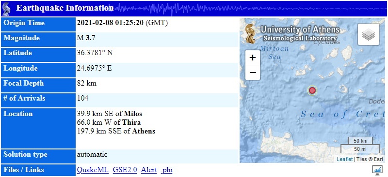 H αυτόματη λύση του Τομέα Γεωφυσικής & Γεωθερμίας του Πανεπιστημίου Αθηνών, δίνει το σεισμό στα 3,7 Ρίχτερ, με εστιακό βάθος τα 82 χλμ., και επίκεντρο τα 39 χλμ. νοτιοανατολικά της Μήλου και 66 χλμ. δυτικά της Θήρας.