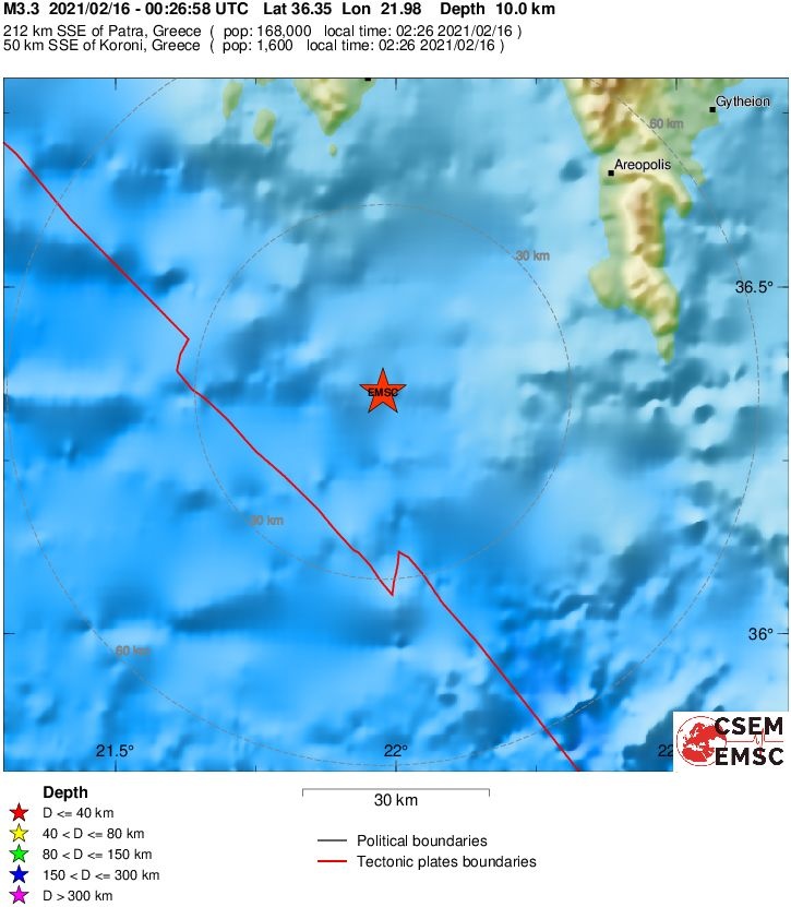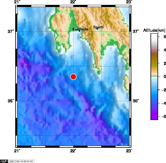 Το ακριβές επίκεντρο της δόνησης εντοπίζεται στα 50 χλμ. νοτιοανατολικά της Κορώνης Μεσσηνίας.