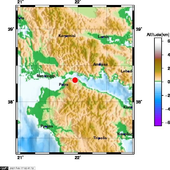 Το ακριβές επίκεντρο τη δόνησης εντοπίζεται στα 21 χλμ. βορειοανατολικά της Πάτρας και 15 χλμ. βόρεια - βορειοδυτικά του Αιγίου.