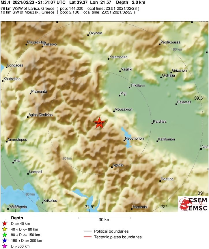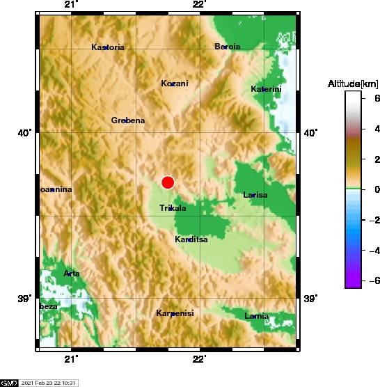 Το ακριβές επίκεντρο της δόνησης εντοπίζεται, 10 χλμ. δυτικά-νοτιοδυτικά του Μουζακίου.