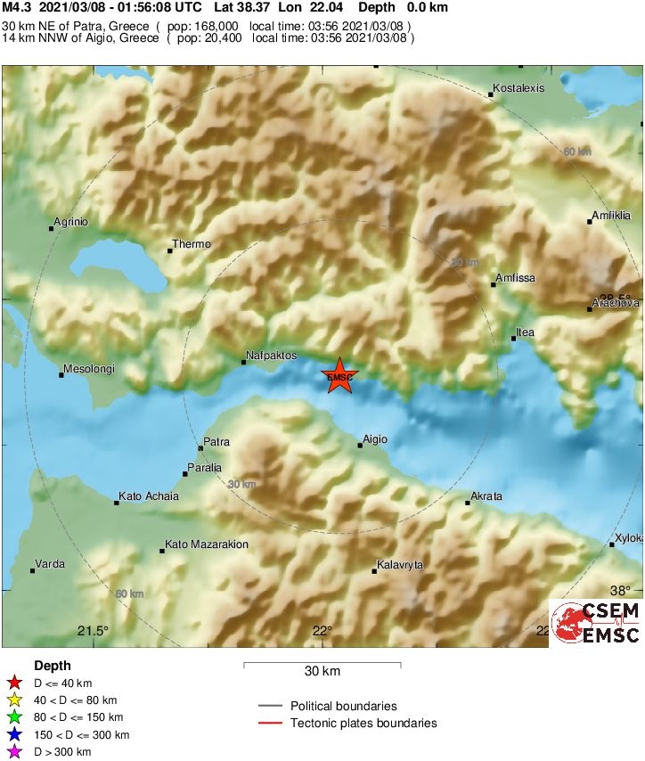 Σεισμός Τώρα: Σεισμική δόνηση μεγέθους 4,3 βαθμών της κλίμακας Ρίχτερ, σύμφωνα με την αυτόματη λύση του Ευρωπαϊκού - Μεσογειακού Σεισμολογικού Ινστιτούτου (EMSC), σημειώθηκε τα ξημερώματα της Δευτέρας (8/3), στις 03:56, σε θαλάσσια περιοχή, στο δυτικό τμήμα του Κορινθιακού Κόλπου.