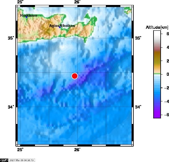 Το ακριβές επίκεντρο τη δόνησης εντοπίζεται στα 156 χλμ. νοτιοανατολικά του Ηράκλειου Κρήτης.