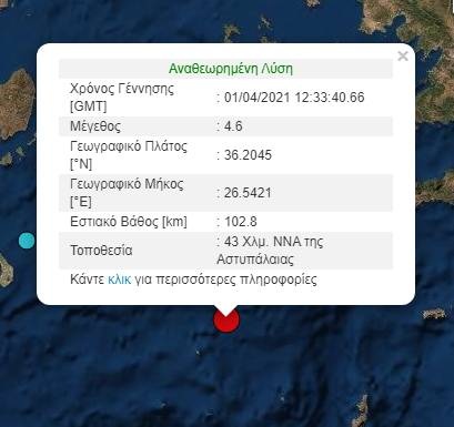 Σύμφωνα με την αυτόματη λύση του Γεωδυναμικού Ινστιτούτου, ο σεισμός είχε μέγεθος 4,6 Ρίχτερ, με επίκεντρο θαλάσσια περιοχή 43 χλμ νότια νοτιοανατολικά της Αστυπάλαιας. Το εστιακό βάθος του σεισμού ήταν 102,8 χλμ.