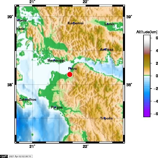 Το ακριβές επίκεντρο τη δόνησης εντοπίζεται στα 9 χλμ. νότια της Πάτρας.