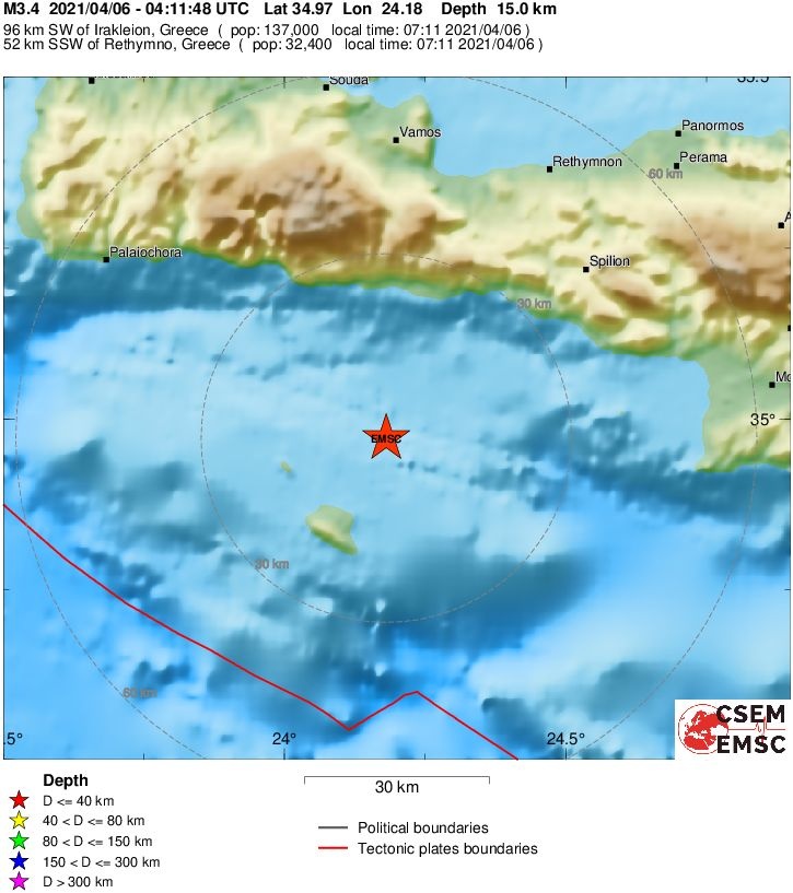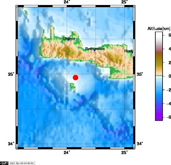 Το ακριβές επίκεντρο της δόνησης εντοπίζεται 96 χλμ. νοτιοδυτικά του Ρεθύμνου.
