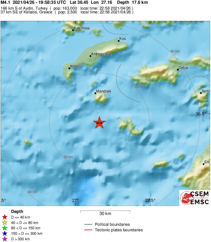 Το ακριβές επίκεντρο της δόνησης εντοπίζεται 37 χλμ. νότια-νοτιοανατολικά του Κέφαλου της Κω.
