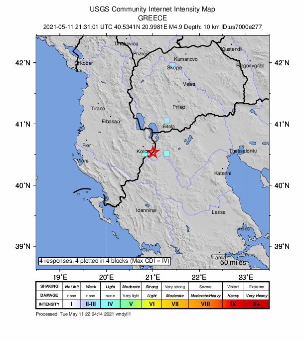 Σεισμός Τώρα: Σεισμική δόνηση μεγέθους 4,7 βαθμών της κλίμακας Ρίχτερ (σύμφωνα με την αναθεωρημένη λύση του Ευρωπαϊκού - Μεσογειακού EMSC), σημειώθηκε στις 00:36 μετά τα μεσάνυχτα (ξημερώματα Τετάρτης 12/5), σε περιοχή δυτικής Μακεδονιάς, κοντά ελληνοαλβανικά σύνορα.