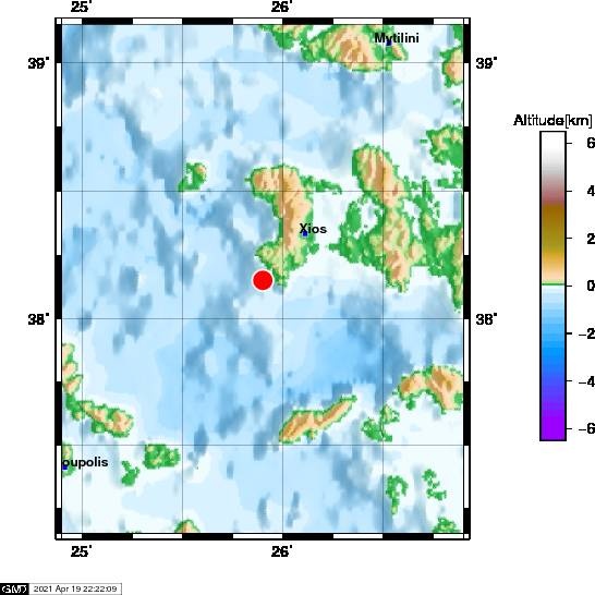 Το ακριβές επίκεντρο τη δόνησης εντοπίζεται στα 35 χλμ. νότια-νοτιοδυτικά της Χίου.