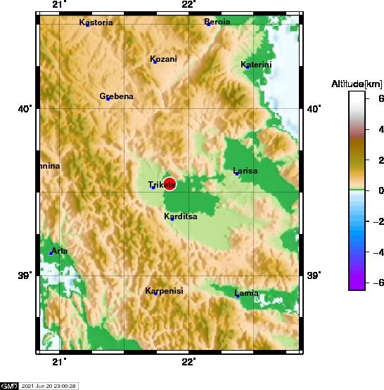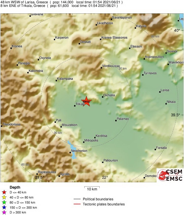 Το ακριβές επίκεντρο τη δόνησης εντοπίζεται στα 8 χλμ. ανατολικά - βορειοανατολικά της πόλης των Τρικάλων.