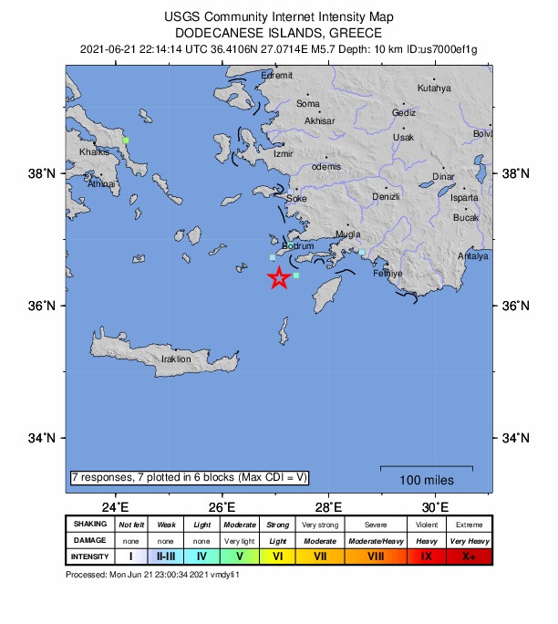 Από την πλευρά του, το Αμερικάνικο Ινστιτούτο Γεωλογικών Ερευνών (USGS), κατέγραψε το σεισμό στα 5,7 Ρίχτερ, με εστιακό βάθος τα 10,9 χλμ. και επίκεντρο 22χλμ. βόρεια - βορειοδυτικά από το Μανδράκι Ρόδου.
