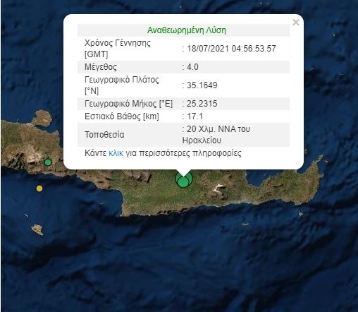 4 Ρίχτερ ταρακούνησαν το νησί της Κρήτης το πρωί της Κυριακής 4 λεπτά πριν τις 8. Σύμφωνα με την αυτόματη λύση του Γεωδυναμικού Ινστιτούτου, ο σεισμός σημειώθηκε 20 χλμ νότια - νοτιοανατολικά του Ηρακλείου με το εστιακό του βάθος να υπολογίζεται στα 17 χλμ.